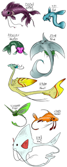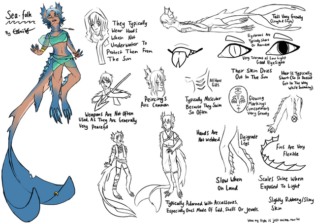 Part 4 of my projectFish Forlje are the most specialized among Forlje since they have the hardest living conditions, human skin would be impossible for underwater living hence they all look less human than other Forlje. They are also the most mysterious since they tend to keep to themselves and need water to live so they´ll only inhabit the seas or large lakes. Language is also a problem for some species even in human form which has been the cause for wars more than once. Flying fish are capable of 'flight' or long distance gliding.