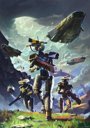 my first mecha painting in my life and this stuff is really hardcore, even if you copy paste parts of the mechas around. was quite some hefty process on this one and I decided to go with slight color only.the mecha base is painted in artrage, then cut out and used to build parts of the mechas. critique is welcome.
