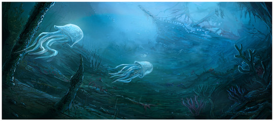 this took me quite long, lots of playing around with the technique and lighting. Still can't really get this kind of 'underwater-ish' glow which looks like it comes from inside of the objects underwater... but OK, at least I tried^^