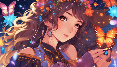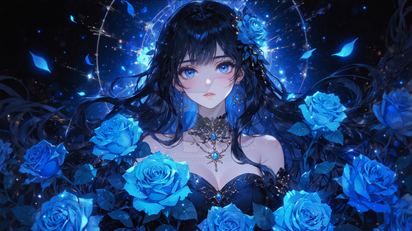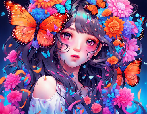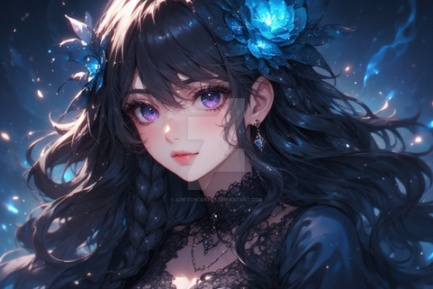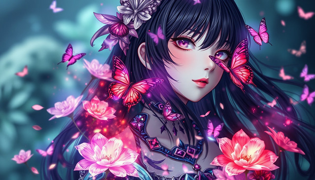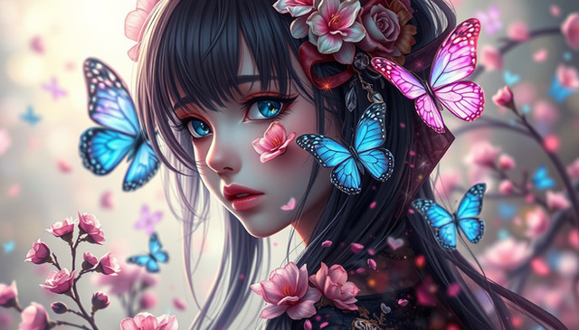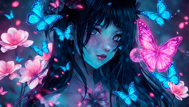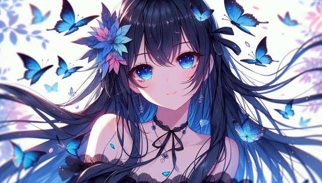 #beauty #butterflies #anime #animegirl #characterdesign #magic #fantasyart #blackhair #blue #ethereal #fantasy #female #flowers #jewelry #orange #whimsical