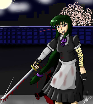 but after I realise it took me a LONG week of nights to color those folds and blood and everything... so, ~~ I left the idea of making the background full of more people which happens to be frightened of her from her rampage
