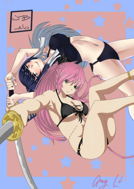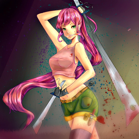 she looks pissed. someone must have shouted YOLO. i mean thats what id do if i had two swords and no shirt.