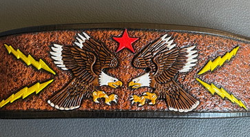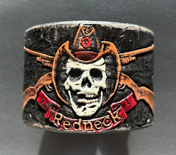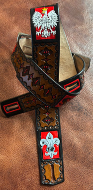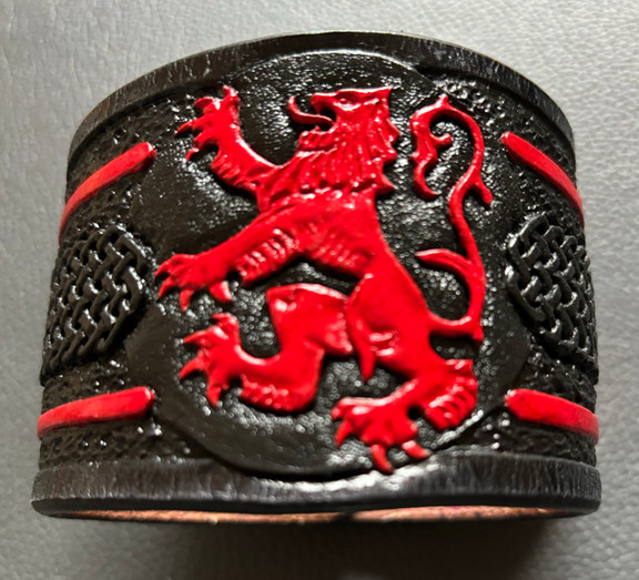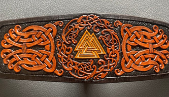 This custom piece is a: hand-drawn, hand-carved, hand-tooled, hand-stained/dyed leather celtic tribal wrist strap.Custom piece for a customer who wanted the trinity with bold tribal lines & her first initial 'M' on the end.