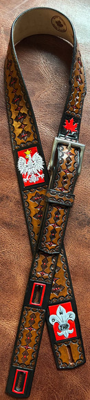 8 ounce veg-tanned cowhide, nickel plated snaps, various stains & dyes.