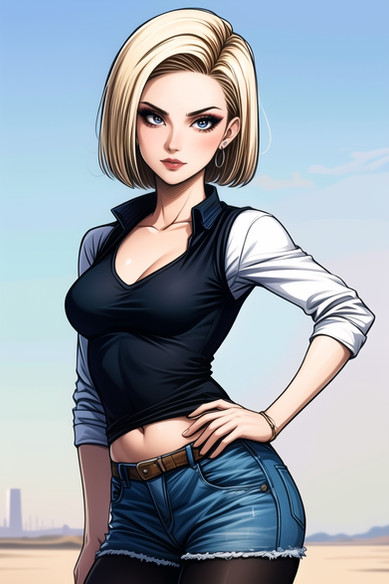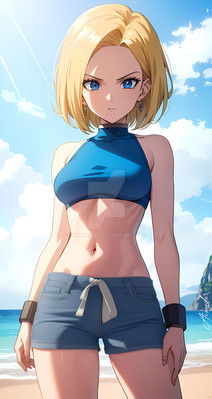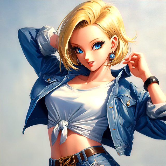 #anime #beachsummer #blondehair #denimjacket #dragonballfanart #pinupphotography #stunningbeauty #android18dragonball #denim_shorts #earringsexy