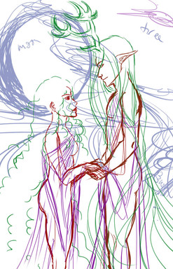 Sort of a follow up image for an ask on tumblr about Cyros showing more of his real look as a forest god around Mal! He’s just a sucker for dropping pretenses and having quality time with people. I’m not sure yet what his full suite of forms is, I know he’s pretty comfy with his human looks. Will need to explore one day.Related content
