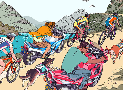 "groovy" colours XD The picture is so fun to look at and I love the futuristic motor cycle thing
