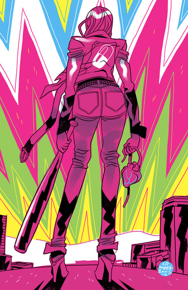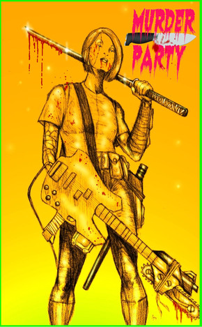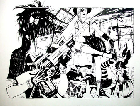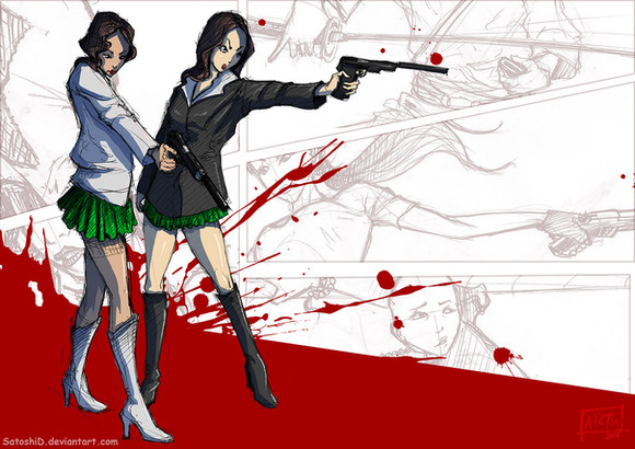 it's suppose to be a self portrait/full figure of herself (commissioner *orange hair*) and her sister... in a John Woo film (kind of).