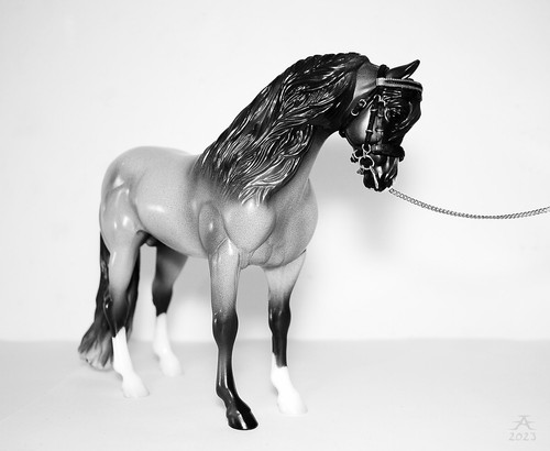 A portrait(?) photo of the Breyer hackney model "Heartland High Tech", which, unlike the real pony, is a mare. My model is named "Symptoms Of Us" and nicknamed Symppy, the name having zero common sense in it. That is how I often name things. I have taken this kind of "show" photos of this model already twice before, but an update was needed.