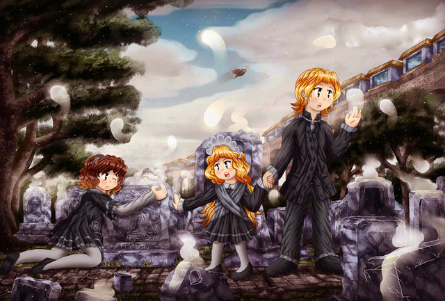 We came up with this story while we were on our way to school. In short, the children's parents were part of a cult (and the children were too). Migel started to develop gray hair, and the parents believed that "demons had possessed him." They decided to lock him up in the basement, but Gabriel stood up for him and ended up getting locked up as well. The brothers stayed there for a long time, and Mariel could only bring them water through the bars. She wasn't very helpful because she was afraid of their parents.
