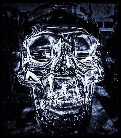 Basically this is blue. Another sketchbook assignment.No I was not depressed when i made it. I made a skull-again I wasn't depressed- by building up bits of little glued pieces of torn paper and painted the whole thing blue. I filled in the skull sockets because I thought it looked too morbid and added strips of a news article. Outside the skull i created the floral motifs again they just work somehow.