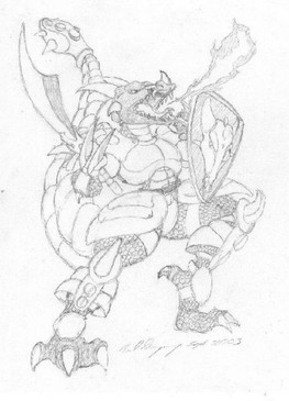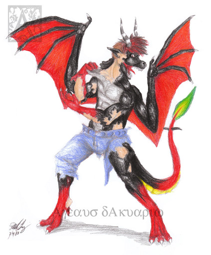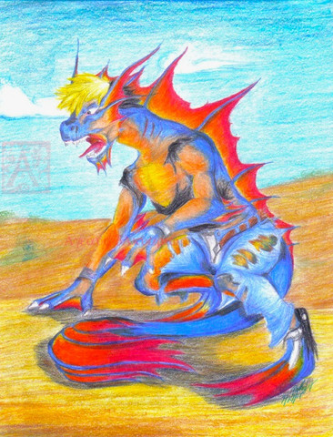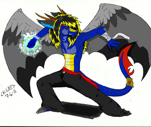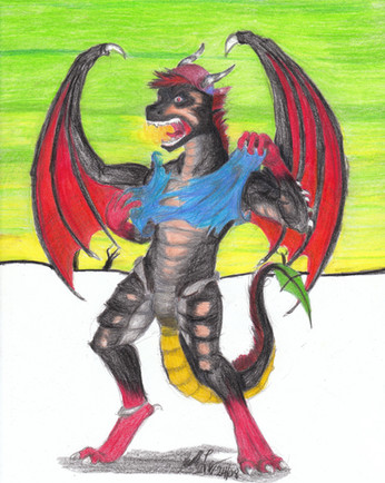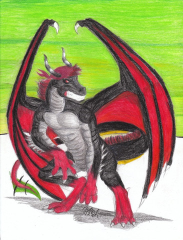 Oooh, neat colorations! I like the folding of the wings and all. The armor disappearing or becoming his scales looks great, too. Veddy neat glowy eyes!