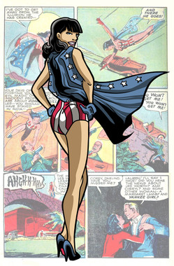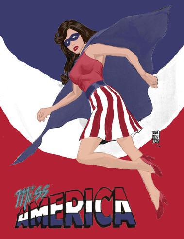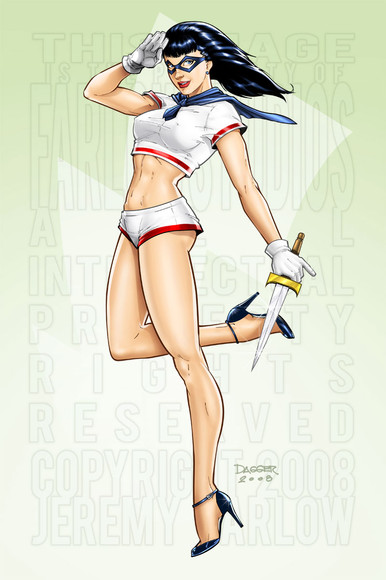 I really enjoyed this commission for The Masked Shrike of the character Pin Up Girl.The pose is based on a George Petty "Petty Girl" pin up from the 40s or 50s, and her face is based on Bettie Page. Classic pinup fun.