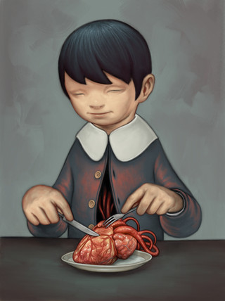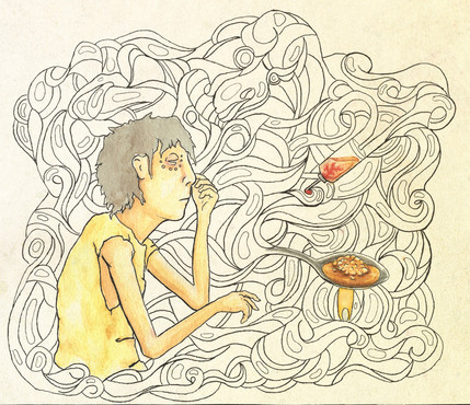 Sort of... I read a fic by a friend in which the P4 MC ate bad food purposefully to make himself sick, and it was really good. So I drew the sketch and did a little color. But I really wanted to make it an original illustration for my website, so I added more stuff and changed the colors.