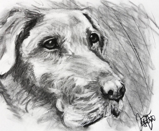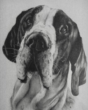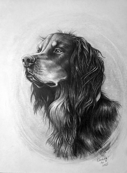 Drawing of an English Setter dog in pencil. Since I was lazy, I only used three of my pencils (B, 4B, 7B). I chose to do this drawing because it had such high contrast. There was constrast in color: some parts were very black and some where pure white. The fur also had a challanging aspect of contrast. Around the face the fur is very short, and on the ears and neck it's longer and curly. I need more practice, but it's a start.Again, I don't usually time myself, but this one took around 3-4 hours.