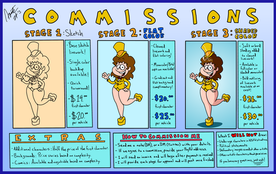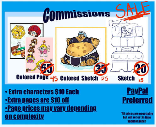 Here is the price guide of commissions I will be doing this year. Limited slots. If you're interested, please send a note to my main account, which can be found on this account's front page. (Please do not send notes to this account, as I do not check on a regular basis)Characters and artwork belong to me.