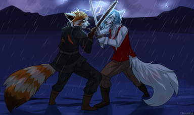 #male #rain #rainstorm #red #snow #anthro #anthropomorphic #battle #blade #duel #furry #leopard #panda #scene #scythe #storm #superhero #supervillain #sword #weapon