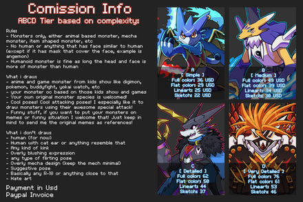 Commissions are open!Due to evolution lines and powered-up forms being a thing, my pricing for multiple Fakemon drawings is a bit different than my pricing for multiple characters in a standard commission, hence the separate sheet. If you're interested, or have any questions, send me a message!