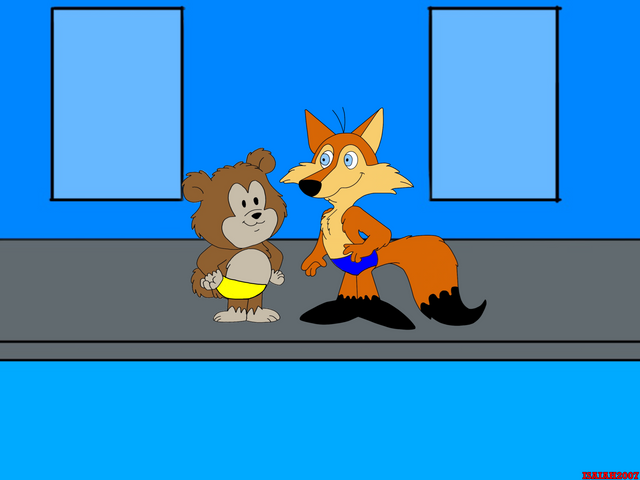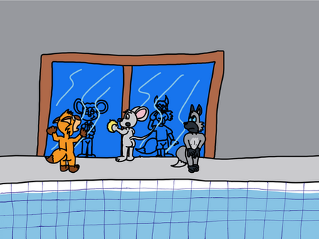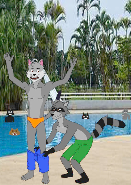 Sly put on a pair of swimming trunks and head toward the shallow part of the pool.Split Kit: Here! Use these!