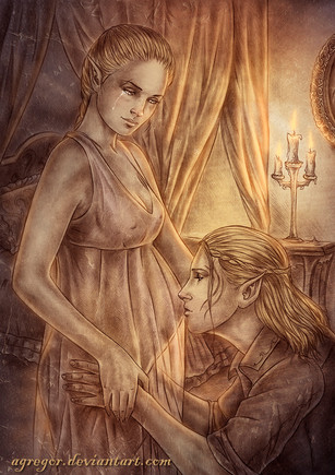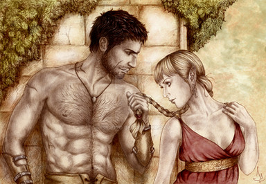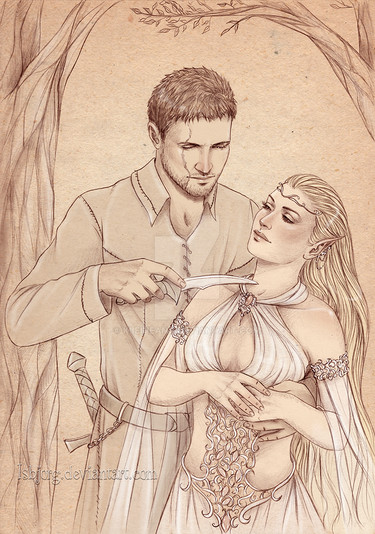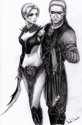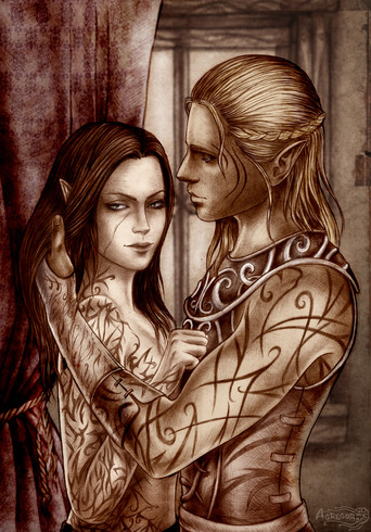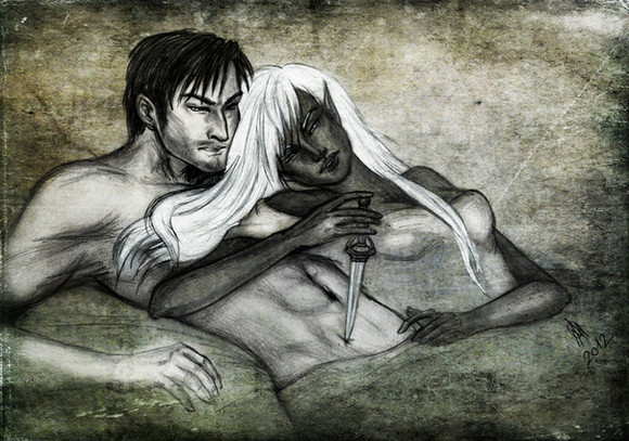It's a really fantastic piece. I actually thought it was supposed to represent Zevran and his Crow Lover whom he (SPOILERS) murders after being convinced, in error, that she's a traitor. It's a moment that gorgeously represented here. I'm actually rather surprised by how much I like it considering I'm not a big Zevran fan.