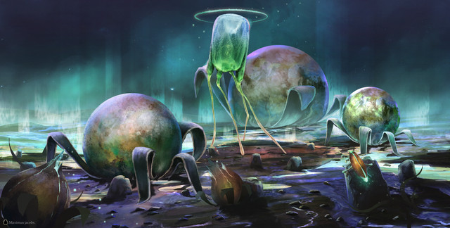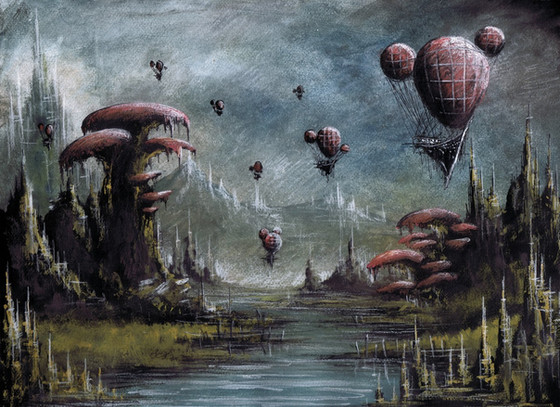 Do my eyes deceive me, or is that a ship graveyard down in the bottommost foreground? Seem to see some overgrown classic rocketships, among them a leaning tailsitter not much larger than the smallest rising pod.
