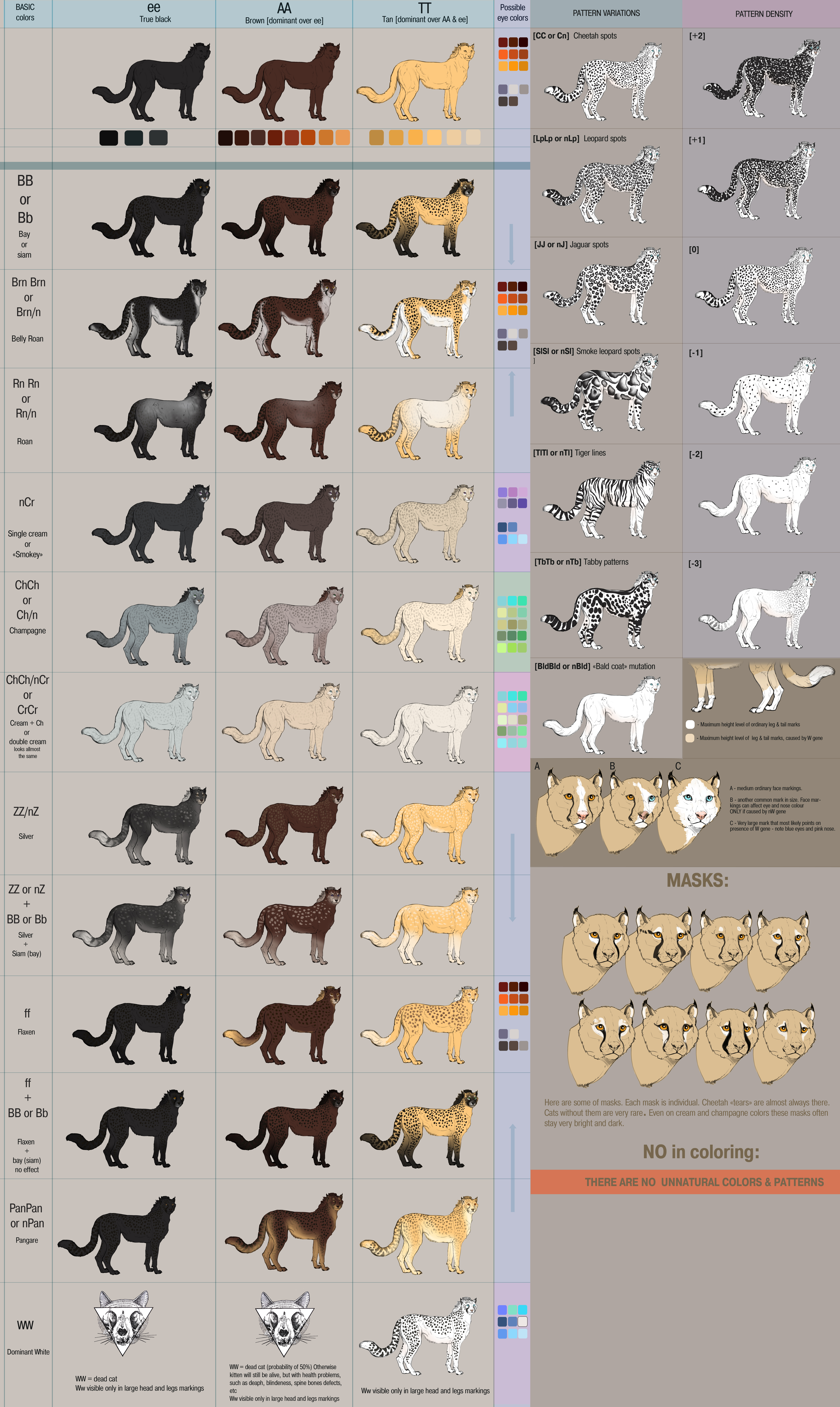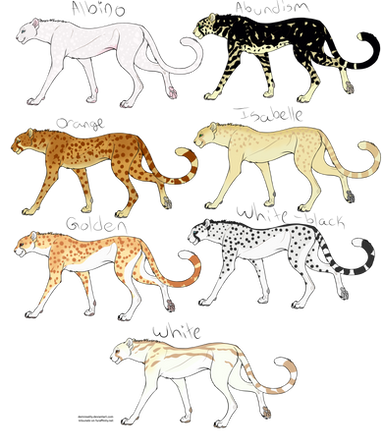 A cheetah color mutation guide I did for my new unfinished roleplay site. The site's currently on a long hiatus and I might never actually launch it, but I thought this would be really neat to share with you guys.All of these pelt variations have occurred at some point or another and are based on information from this site: www.messybeast.com/genetics/mu… (in case the site is down for any reason here's an archived version of the page: web.archive.org/web/2013082208… ) I did use a little bit of creative liberty with the exact colors and marking positions, since there are no photographs of mutant specimens except for king cheetahs (UPDATE: a ticked (spotless) cheetah has been photographed in Kenya! www.dailymail.co.uk/news/artic… ).