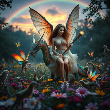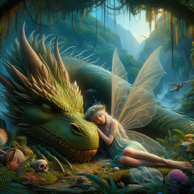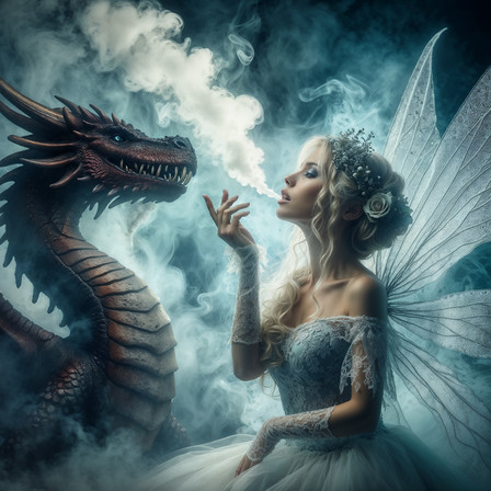 n a tranquil glade, a whimsical scene unfolds as a carefree fairy reclines, leisurely puffing on her pipe, accompanied by her loyal dragon buddy. The soft glow of magical embers illuminates the serene atmosphere, casting a warm light on the pair as they share a moment of relaxation and camaraderie. The fairy's wings shimmer with ethereal grace, and the dragon, a testament to mythical friendship, gazes contentedly. This enchanting portrait captures the essence of magical respite, where fairy and dragon find solace in each other's company amid the wonders of a fantastical realm.Related content