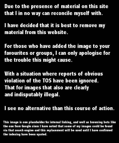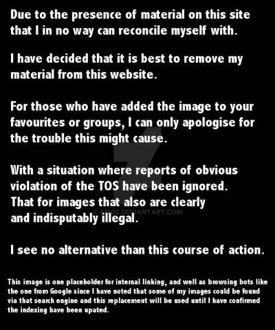 Due to the fact that this site not only host but also apparently defend the distribution of child sexual abuse content, I have decided to take down my presentations.Such images have been reported by me to the staff of DA 3 times, both photos and artwork, on neither case were any action taken.
