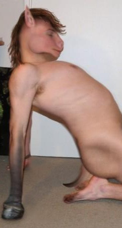 Update: I have now applied more recently-acquired techniques to this image, to bring it up to date. Facial hair/fur is now more well-defined, and extends further across the face (although the same region that had the hair/fur before still has significantly more). Other parts of the body now have more fur-like body hair, and the nose has been altered to make it more canine.