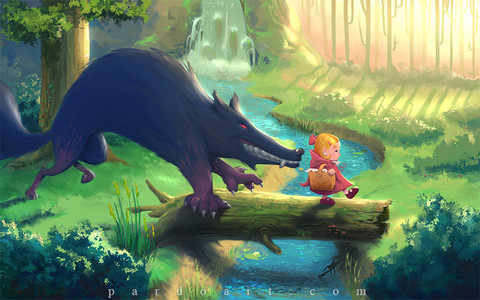 What a sweet pitiful expression on the wolf's face. Β C'mon Red, just give the wolf a share from your basket.Β