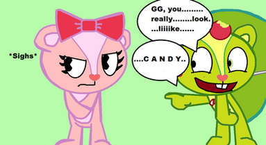 A Giggles le parece mono Nutty y se sienta junto a el en ... una plataforma gris XDDDDDDD ( no me salia muy bien dibujar un banco asi que dibuje eso) Pero a Nutty no quiere a Giggles, el quiere a las chuches y Giggles no se da cuenta de eso. Pero ... derrepente ... cuando Nutty se iva a ir de alli ... pisa un chicle y se lo come. Y asi amigos ... es como Giggles pierde todo el amor que tenia con Nutty