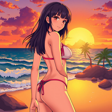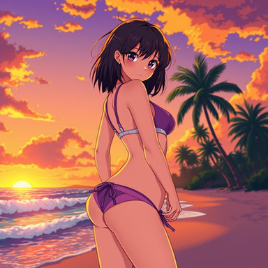 #fanart #anime #videogamefanart #beach #ass #bikini #blackhairedgirl #breasts #perky #splashes #sunset #twisted #undressing #vibrant #smalltits #looking_back #thighgap #grabbingbutt