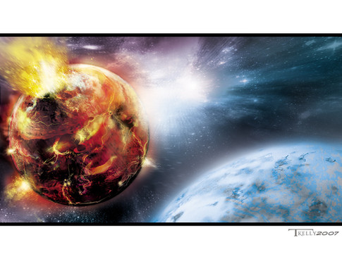 An unaffected, lifeless planet colliding with two worlds.The one spreading life and light, bringing beautiful nature, turning rocks into plants and dust into water.