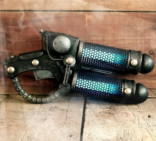 A replica LeMat revolver I dressed up with some copper tubing, a pressure regulator thingy, and some holes.When using this, I crammed some glowsticks down the lower barrel so that cool arcane light would glow from the holes. This didn't work very well, so I'm thinking of coming up with some sort of LED lighting to put in there.