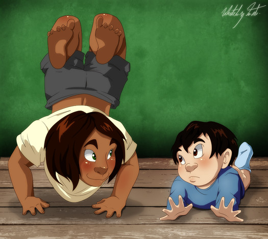 Commission for of his characters Darren and Anika, with Anika teaching Darren how to do a handstand. Already he's doing better than I would lolHope you like it! ^^