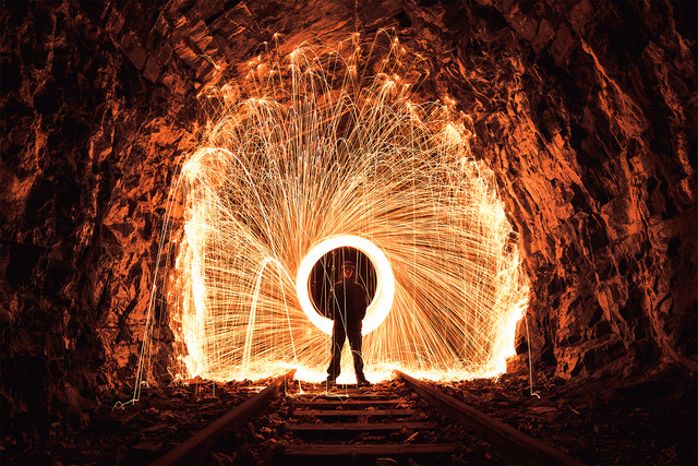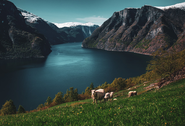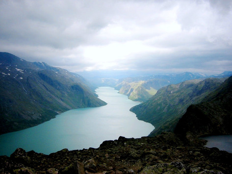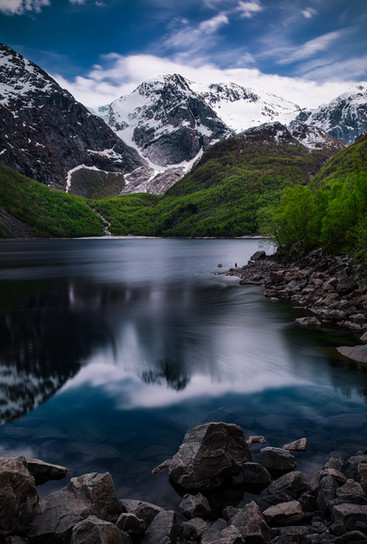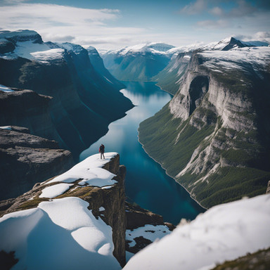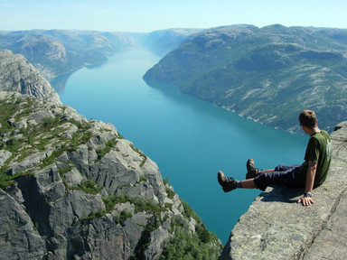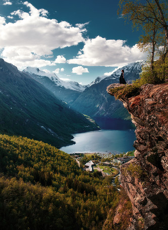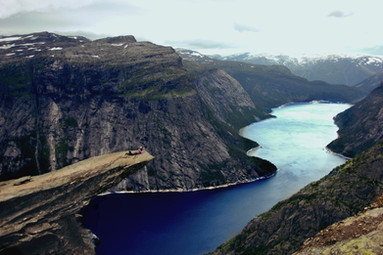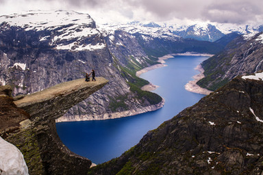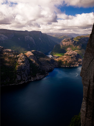 Ah, such a breathtaking scene, if I were to glance over the edge of that ledge, I would also be on my knees (perhaps due to the spectacular view, in addition to the fear of falling off). I love the composition (and the perspective) of the photograph, it gives due attention to the magnificent cliff as well as the lake below. The deep blue colour of the water is enchanting.