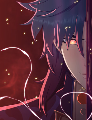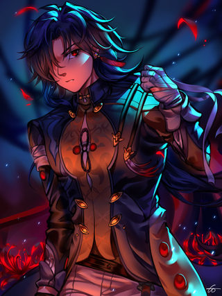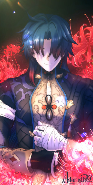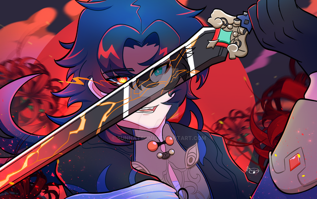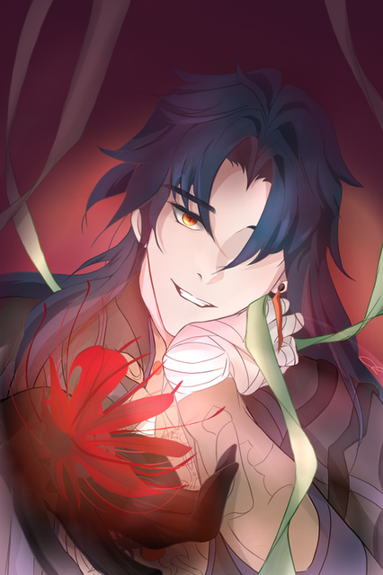 Blade from Honkai Star Rail, a mesmerizing aura surrounds him. With Lycoris Radiata flowers gracing the background, his shining eye exudes a captivating and powerful gaze that truly embodies his essence.Commission for lotuslioness