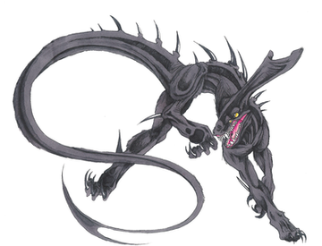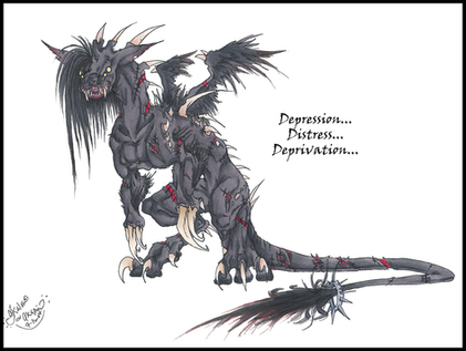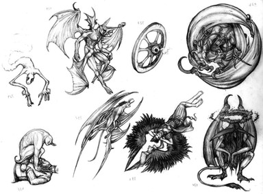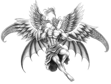 lessee... a single horn..... what looks like a cracked lamp maybe?.... multiple wings, one set of 'angelic', one set of 'demonic', one set which turns from 'angelic' to more 'demoic'..... damages over eyes I guessing?...... Dragon tail..... wolf or cat like ears.......