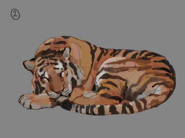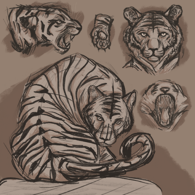 The tiger laying on its back is referenced from a photo, which is copyright to its owner.The rest of them are drawn while watching live footage.