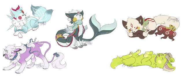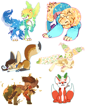 I wanted to do a little dump of a bunch of the finished soosh art I've done since becoming a guest artist! It's still really mind blowing and amazing to be able to be a part of it after adoring this species for so many years!These are all designs done by me, the teal, purple, and orange/green ones were for sales, the rest are my personal characters! The exception being the one in the top left, who was a spikedpeach soosh I gave a small revamp.