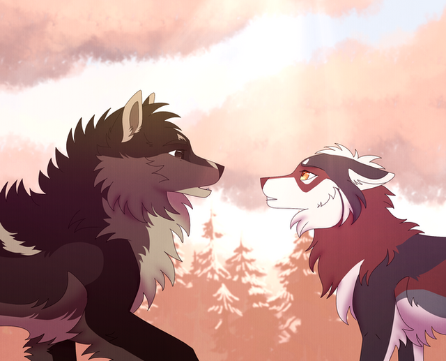If Khatar knew she was going to be up in his face, he would have run. He backed up, bumping against the bark of a tree as the ginger wolf leapt up and into his space, wagging her tail a mile a minute. It crashed into the branches surrounding her, and Khatar cringed. Oh. She talked very fast. Very. He pulled his head back as far as he could, his lips curled over the front of his teeth as a warning while she continued to ramble on in her strange accent.