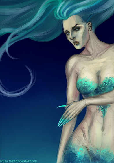 This is my original character, Rihanna, from my novel "Otherworld Legacy". She's the element of water and a Siren, a species which according to the trilogy is the most powerful and intelligent humanoid species on earth. They existed long before humans and were blessed with divine beauty. They live for thousands of years but their aging stops at the age of 25-30. Rihanna is an Undine, an amphibian Siren species. She's 36,000 years old but looks like being in her late 20's. Her song can drive humans crazy and make them murder everyone around them, while for male Sirens it's completely harmless. Her spiky fins are filled with one of the deadliest and unidentified toxins that kill in seconds. Once calm, her beauty can easily seduce any man, but once threatened, a defensive state is triggered and gives her a frightfull appearance. He nails sharpen and can tear metal, the thorns pop out of the fins' tips and her fangs grow. The Undine bite is famous as, "They never let go.". Once they bite, they don't open their fangs jaws until whatever they have bitten is torn; be it flesh, be it bone, be it metal, be it rock. Rihanna always wears the Eye of the Ocean on her neck, a drop-shaped gem with extraordinary power which helps her watch the world and do her part as an element along with her three sisters. She's the eldest of the four and the most caring person. She's selfless and wills to sacrifice her own life to protect her children. She's wise and smart and her practical mind helps her find solutions where others can't. She's peaceful and kind like the flowing water but her secretive nature creates a mystery around her. She had a tough past but keeps on smiling, no matter what.