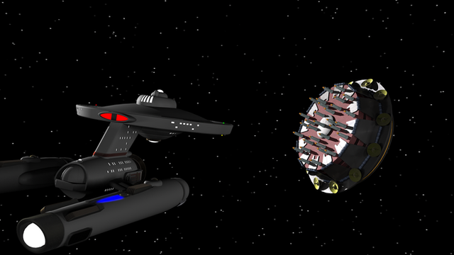 ~ Year 2373, three days after First Contact ~A temporal distortion opens up, it's Borg signature. However, exiting it is a small Federation ship, of unknown design. It is being attacked by a Borg diamond, the Queen ship. Rufus orders the ship to battle, defending the small ship.