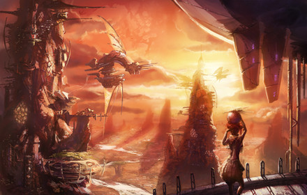Wow...just...wow. What an enchanting and beautiful enviorment! The girl's wings are so unique. I love the shape of the trees. The colors are so warm and inviting, it makes me want to live there!