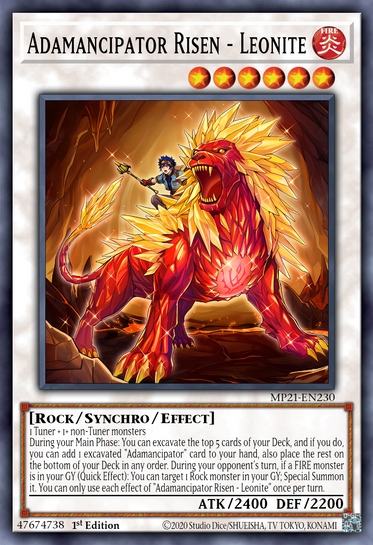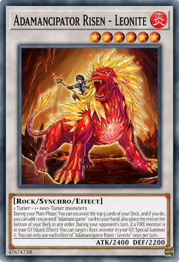 During your Main Phase: You can excavate the top 5 cards of your Deck, and if you do, you can add 1 excavated "Adamatia" card to your hand, also place the rest on the bottom of the Deck in any order. During your opponent's turn, if you have a FIRE monster in your GY (Quick Effect): You can target 1 Rock monster in your GY; Special Summon it. You can only use each effect of "Adamatia Rise - Leonite" once per turn.