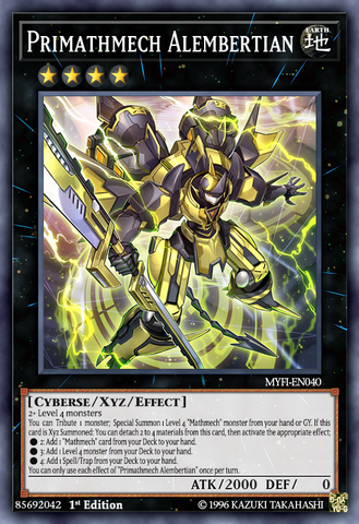 If this card is Xyz Summoned: You can detach 2 to 4 materials from this card, then activate the appropriate effect, based on the number detached; 2: Add 1 "Mathmech" card from your Deck to your hand. 3: Add 1 Level 4 monster from your Deck to your hand. 4: Add 1 Spell/Trap from your Deck to your hand.You can Tribute 1 monster; Special Summon 1 Level 4 "Mathmech" monster from your hand or GY. You can only use each effect of "Batch Mathmech d'Alembertian" once per turn.