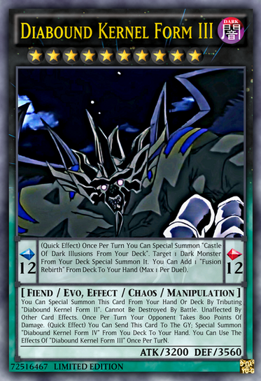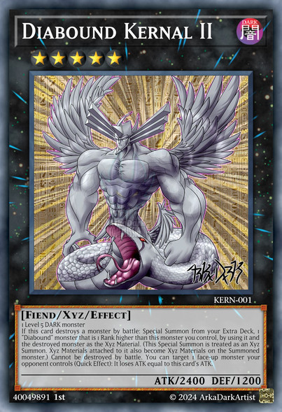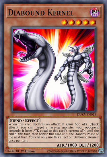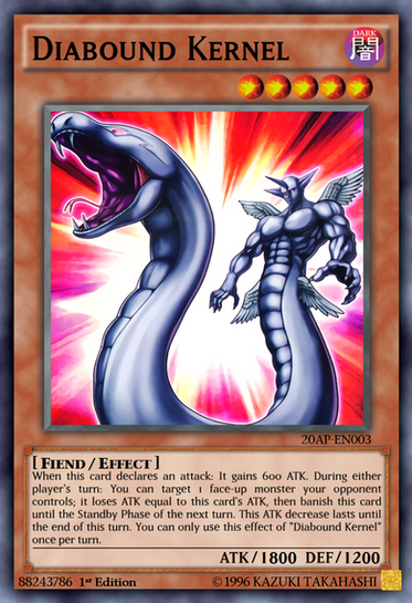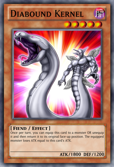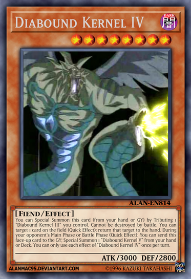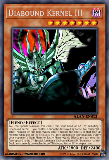 You can Special Summon this card (from your hand or GY) by Tributing 1 "Diabound Kernel" you control. Cannot be destroyed by battle. You can target 1 face-up monster your opponent controls (Quick Effect): It loses ATK equal to this card's ATK. During your opponent's Main Phase or Battle Phase (Quick Effect): You can send this face-up card to the GY; Special Summon 1 "Diabound Kernel III" from your hand or Deck. You can only use each effect of "Diabound Kernel II" once per turn.