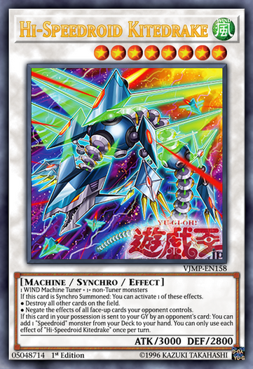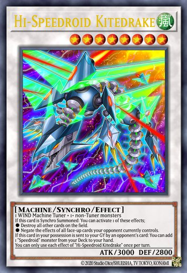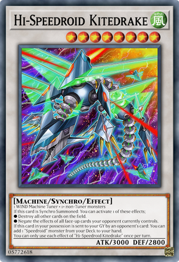 "Sharp edged champion who looks down on adversaries from high, grace us with your presence and cut through the lines of enemies! Synchro Summon! Appear now! Level 8! Hi-Speedroid Kitedrake!"