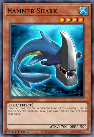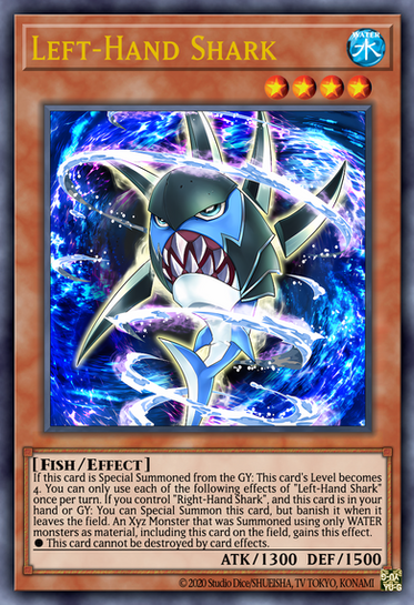 If this card is Special Summoned from the GY: Its Level becomes 4. You can only use each of the following effects of "Left-Hand Shark" once per turn. If you control "Right-Hand Shark", while this card is in your hand or GY: You can Special Summon this card, but banish it when it leaves the field. An Xyz Monster that was Summoned using only WATER monsters on the field including this card as material gains this effect.