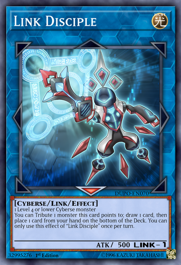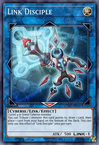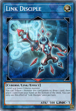 You can Tribute 1 monster this card points to; draw 1 card, then place 1 card from your hand on the bottom of your Deck. You can only use this effect of "Link Disciple" once per turn.